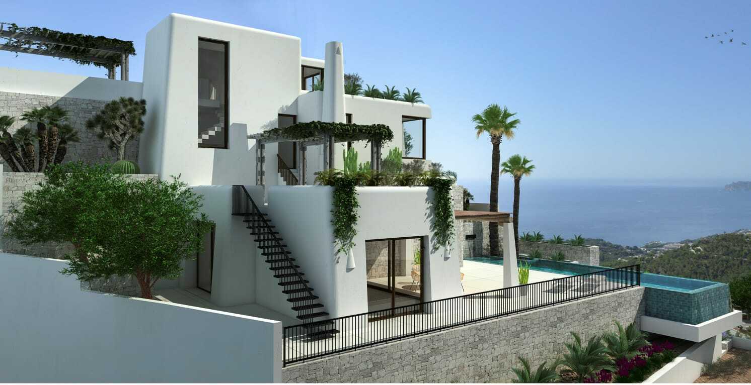 Special attractive Ibiza style Villa with sea view, 4 bedrooms, 4 bathrooms, an elevator and a large infinity pool in Moraira