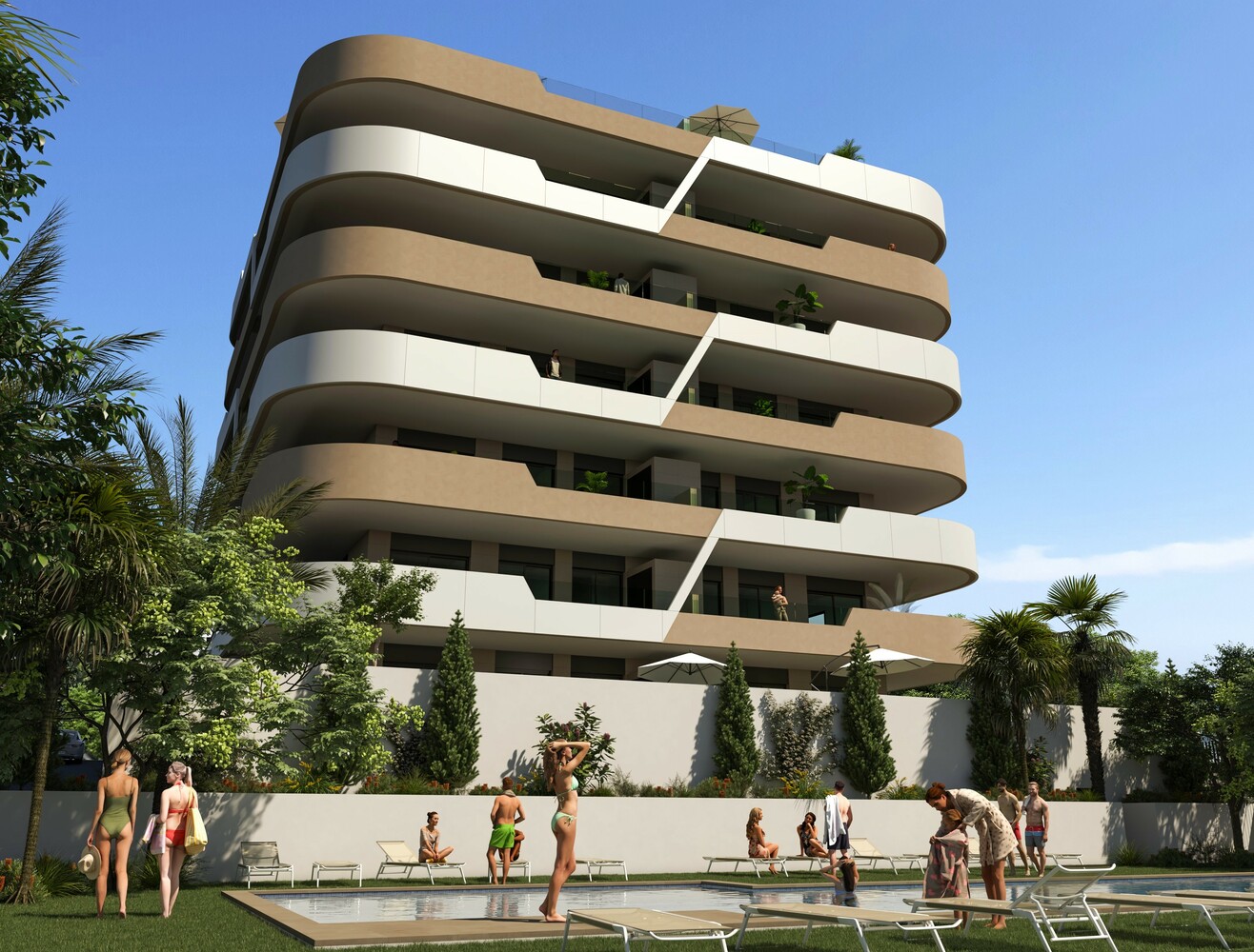 This apartment complex just 600 meters from the sea with 2 bedrooms and 2 bathrooms floor apartments, ground floor apartments and Penthouses is being built in Arenales del Sol, 10 minutes from Alicante airport. Arenaels del Sol has one of the best beaches on the Costa Blanca and has a beautiful promenade close to the beach. It is also a perfect place for all kinds of water sports. In addition, the pleasant center of Alicante is easily and quickly accessible due to the excellent connections. In short, a great location on the sun-drenched Costa Blanca, just minutes from the airport and the center of Alicante.