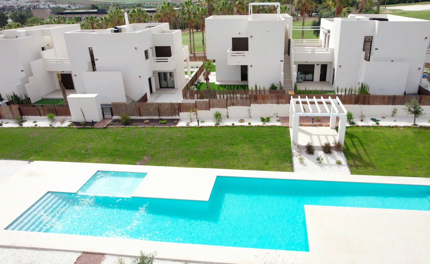 These terraced houses have a very nice appearance because natural pebbles are partly incorporated in the outer walls. They are being built in Algorfa, just 35 minutes from Alicante airport. A very beautiful area where hikers, cyclists and mountain bikers can enjoy the beautiful green surroundings. In addition to the various sports facilities such as a gym, paddle and tennis courts, the luxury golf resort also has a 5-star hotel with a Spa and many different good and affordable restaurants up to high-class restaurants. A supermarket and other facilities can be found a short distance away.