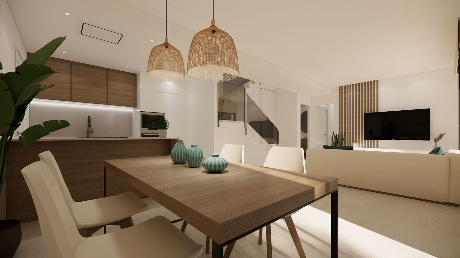 These detached villas, with a living area of 116 m², stand out because of the use of partially woodgrain tiles, which create a beautiful contrast with the white walls of the house. The house has two floors. The ground floor features a living room with a modern open-plan kitchen. There is a separate toilet and one bedroom with an en-suite bathroom. The staircase to the upper floor is beautifully finished. Upstairs, there are two more bedrooms and a bathroom. Adjacent to the bedrooms are two large terraces accessible through sliding doors. The swimming pool is 14 m², which can be expanded if desired. There is also an outdoor shower. The villas all have a private driveway and a separate laundry room outside. The house has a large terrace at the front and side, partly covered with artificial grass.