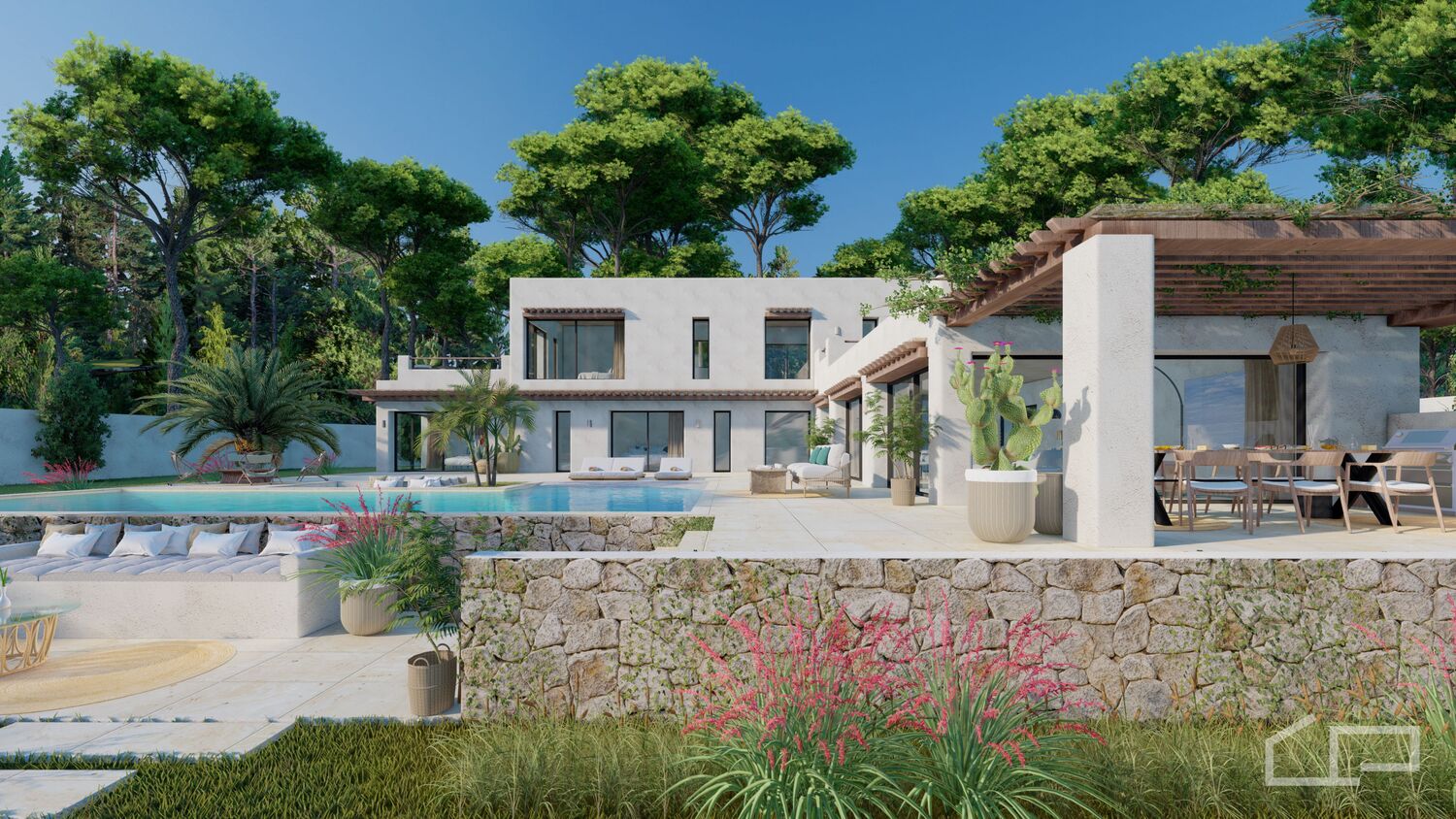 In Javea, in the Monte Olimpo urbanisation, this exclusive design villa is being built with stunning views of the Montgó and the sea. There are beautiful sandy beaches here, as well as rugged areas with enormous cliffs. All necessary facilities are available within a short distance. You will also want for nothing in terms of sports, as there are tennis and padel courts, walking paths, a riding school, golf clubs, and marinas. Additionally, there is an international school.