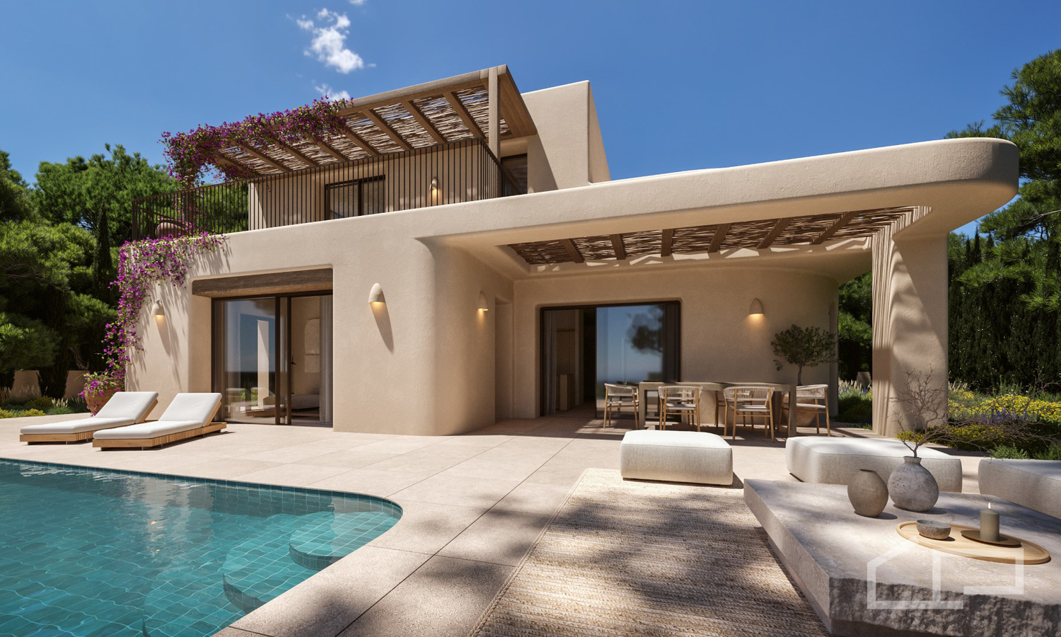In Javea, this elegant Ibiza-style villa is being built with spectacular views of the sea, mountains, and nature. Just a few minutes away are picturesque sandy beaches and coves, as well as rugged areas with enormous cliffs. Additionally, all necessary facilities are available. You will also want for nothing in terms of sports, with tennis and padel courts, walking trails, a riding school, golf clubs, and marinas. There is also an international school.