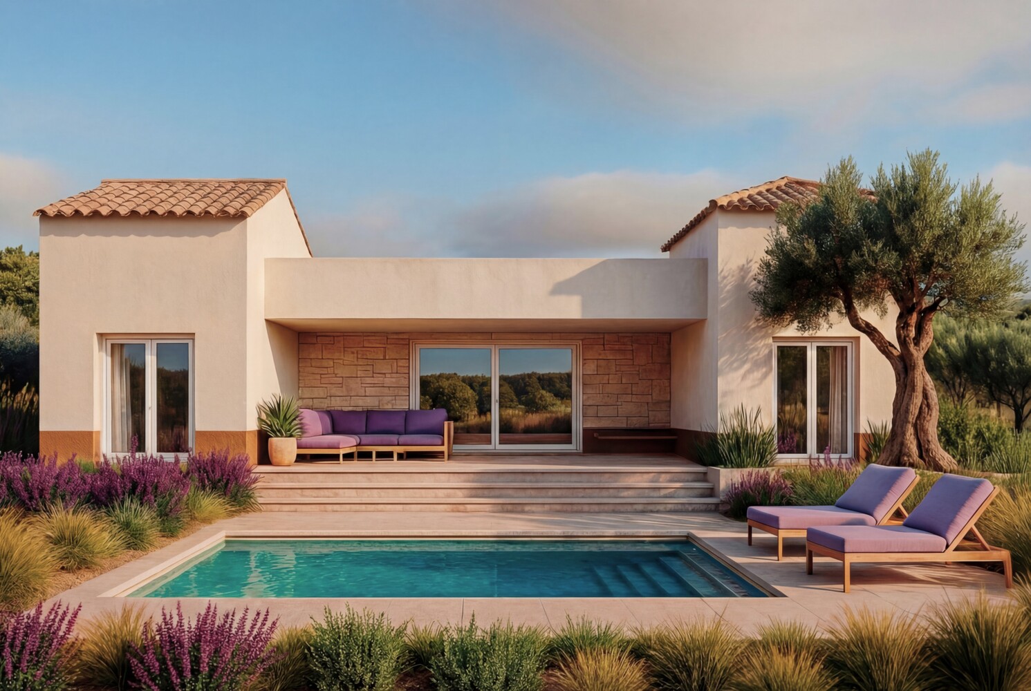 This stunning single-story villa with 3 bedrooms starts at €399,900.00 and is being built on plots starting from 10,000 m². This energy-efficient home, with a frontage of 18 meters and a built-up area of 155 m², benefits from beautiful natural light thanks to the sliding doors on both sides. Upon entering, the house features a hall with a wardrobe, a spacious living room of 46 m² with an open kitchen, and an additional utility room of 6 m². There are 3 bedrooms and 2 bathrooms with underfloor heating, the master bedroom having an en-suite bathroom and a walk-in closet. The beautiful natural stone accents on the interior and the natural stone exterior wall by the covered terrace are lovely details. The impressive outdoor space with a covered terrace features an 8 x 4 meter swimming pool, with the option to enlarge it. 250 m² of gravel installation with geotextile is included, and naturally, there is a private driveway with a brick entrance gate. The finishing and layout of the home can still be customized entirely to your own wishes. There are also various plots of land in our portfolio for you to choose from, of at least 10,000 m². The entire process from A to Z is under Dutch supervision. This villa can be built in 5 different versions.
