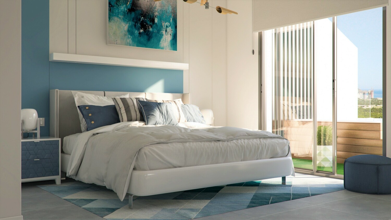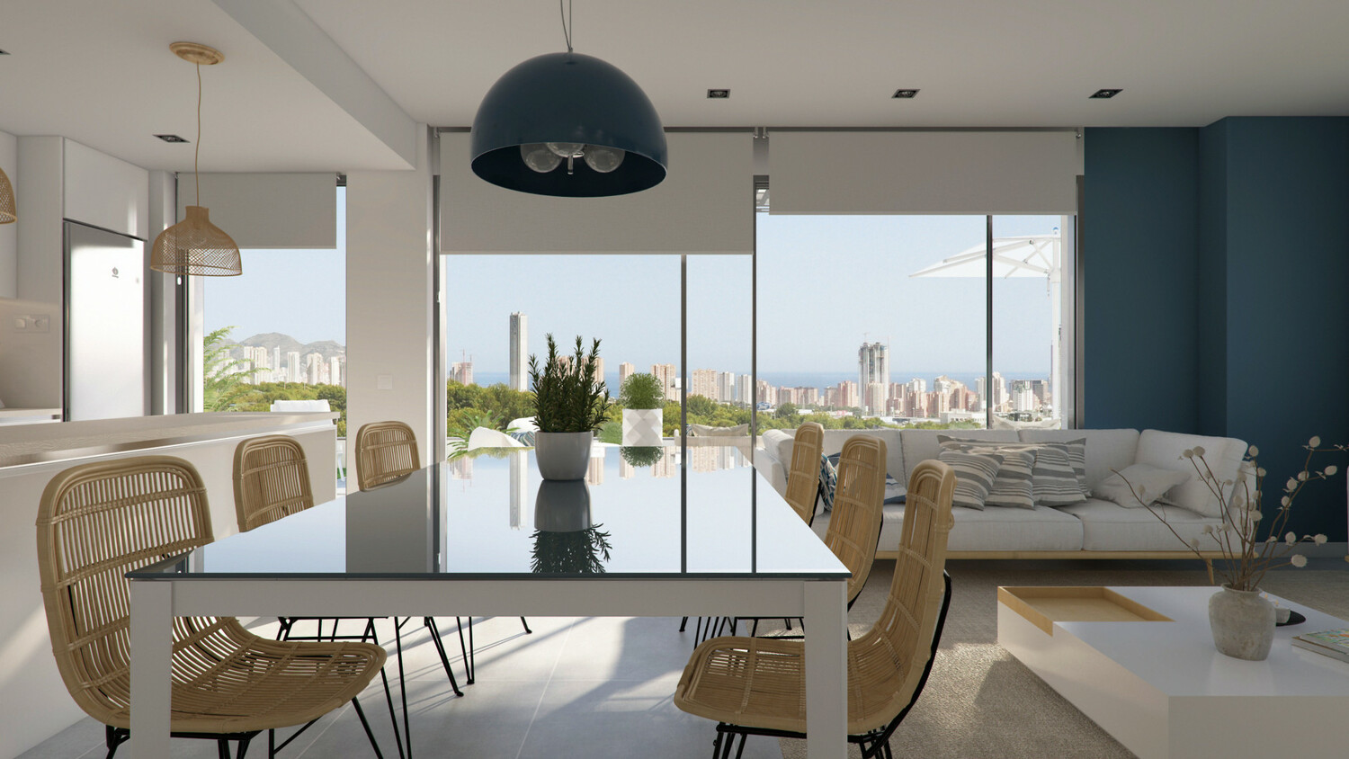 Deze bijzonder vormgegeven verdieping appartementen met 2 of 3 slaapkamers en 2 badkamers zijn gelegen op een opvallend mooi afgesloten en beveiligd complex dat tussen de heuvels ligt, met een buitengewoon spectaculair uitzicht op de sky-line van Benidorm. De appartementen zijn voorzien van een prachtig groot terras van 35 m2 voor de 2 slaapkamer appartementen en 42 m2 voor de 3 slaapkamer appartementen. Er is een garage en een prive berging voor fietsen. De zeer luxe gemeenschappelijke ruimte heeft een binnen- en een buitenzwembad, een jacuzzi, een in- en outdoor Gym en Padel banen.