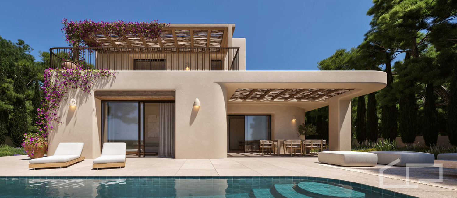 In Javea wordt deze elegante Ibiza stijl Villa gebouwd met spectaculair uitzicht op de zee, bergen en de natuur. Op slechts enkele minuten afstand zijn er pittoreske zandstranden en baaien maar ook ruige gedeeltes met enorme kliffen. Daarnaast zijn alle benodigde faciliteiten beschikbaar. Ook op sportief gebied zult u hier niets tekort komen, zo zijn er tennis- en padelbanen, wandelpaden, een manege, golfclubs en jachthavens. Er is ook een internationale school.