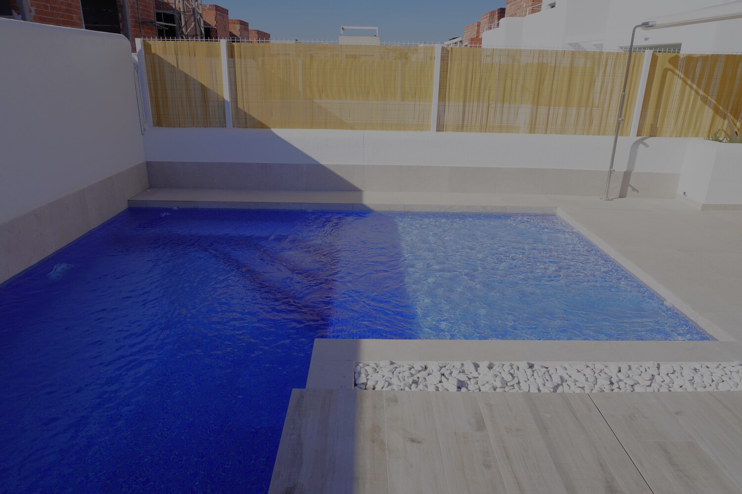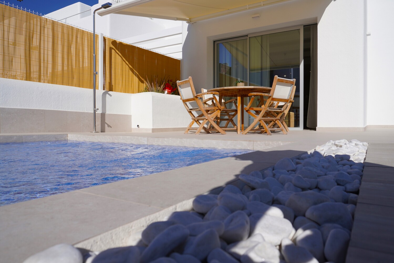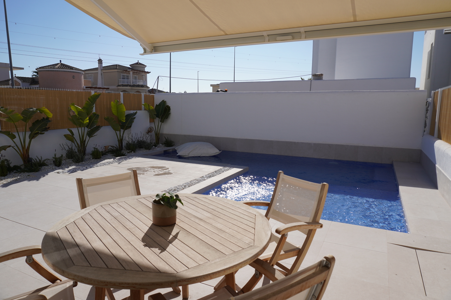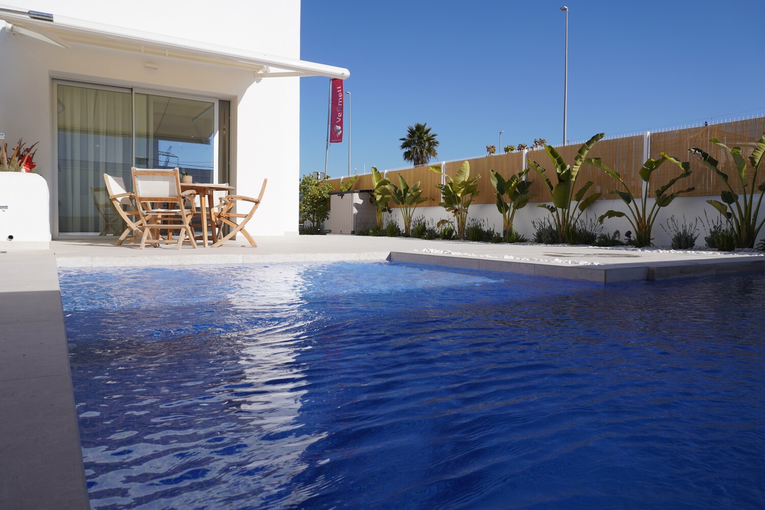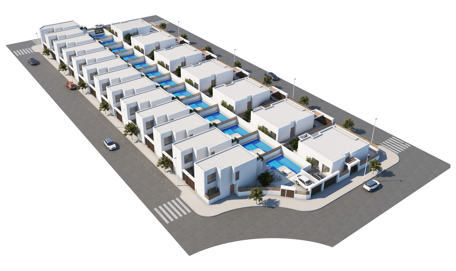 Deze schitterende villa’s met een woonoppervlakte van 109 m2 in unieke bouwstijl zijn voorzien van 2 woonlagen, 3 slaapkamers en 3 badkamers waarvan 1 slaapkamer met badkamer op de begane grond. Beide slaapkamers op de 1e verdieping hebben een badkamer en suite en 1 van de slaapkamers heeft een balkon. Rondom de woning is er een tuin/terras van 120 m2 met mooie beplanting en sfeerverlichting. Het zwembad van 23 m2 heeft ook een ondiep gedeelte van 30 cm wat ideaal is voor kleine kinderen. De villa’s hebben allen een privé oprit.